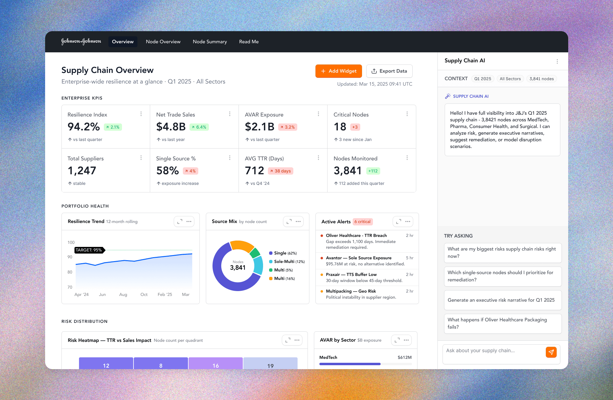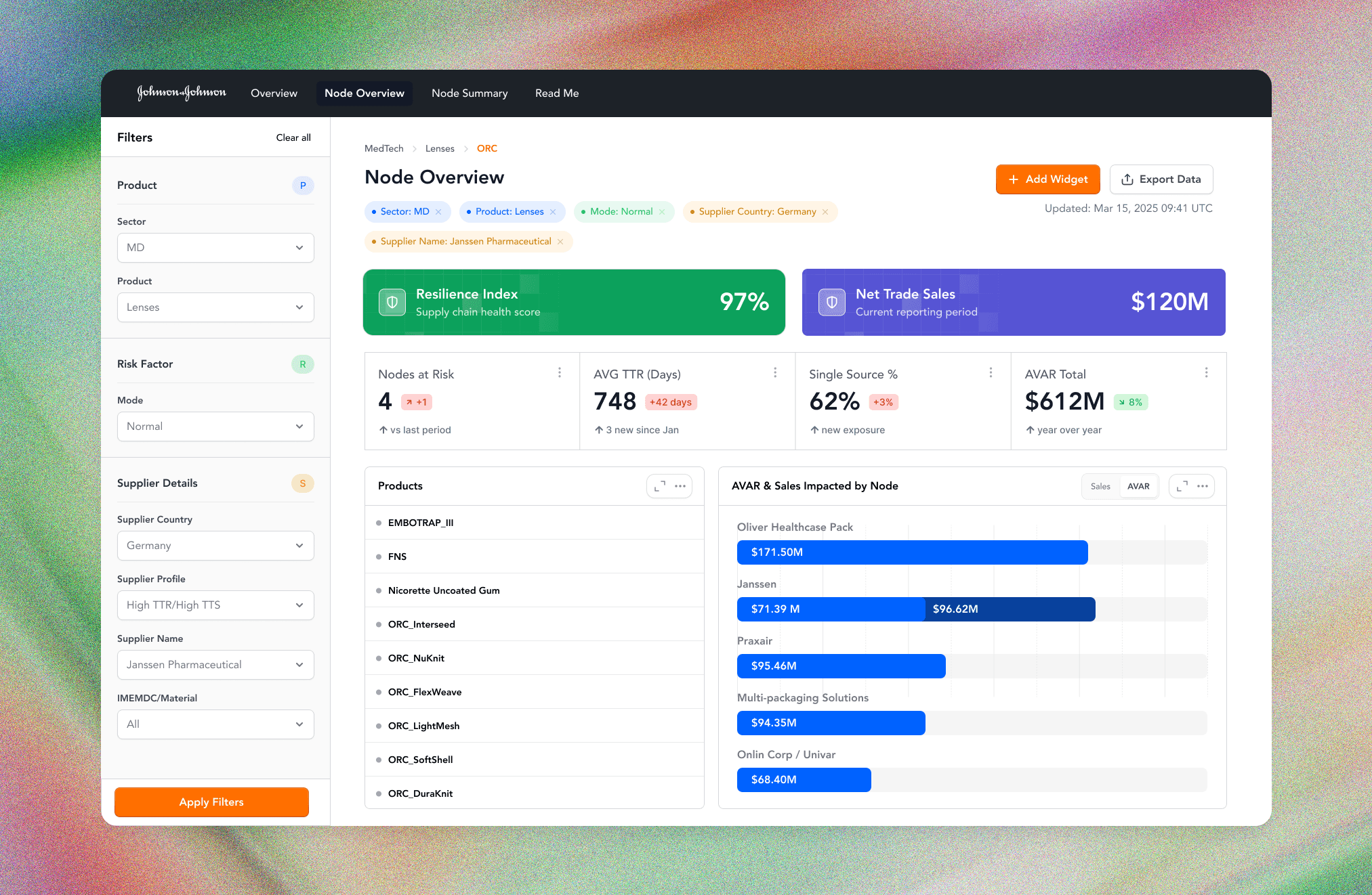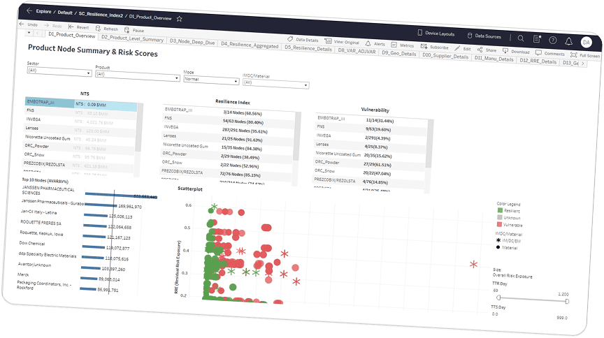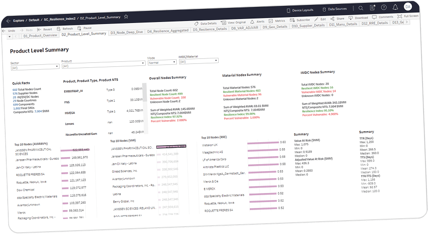 A contextual filter panel with persistent state lets analysts drill into specific sectors, products, or suppliers. Resilience scores, AVAR exposure, and product breakdowns update in real-time, replacing the need to cross-reference 3 separate tabs.